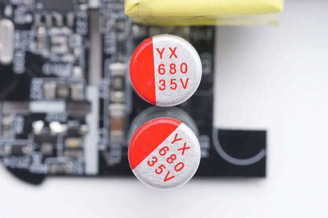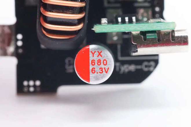 Yunxing low-voltage filtering solid-state capacitor, specification 16V 680 μF. Application case: 1. Disassembly report: Gushi Technology 20W PD fast charging charger